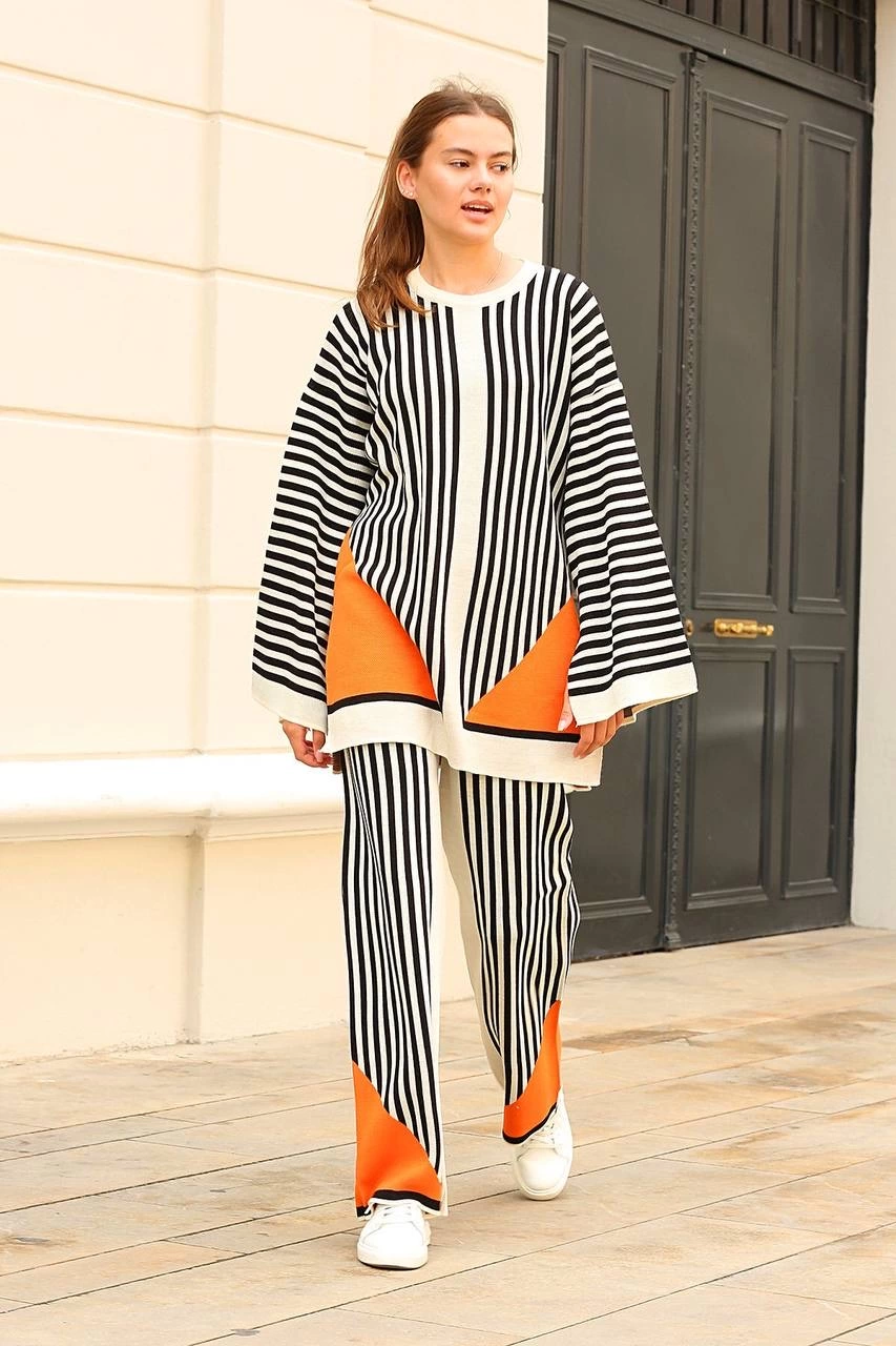 Çizgili bisiklet yaka triko takım beyaz