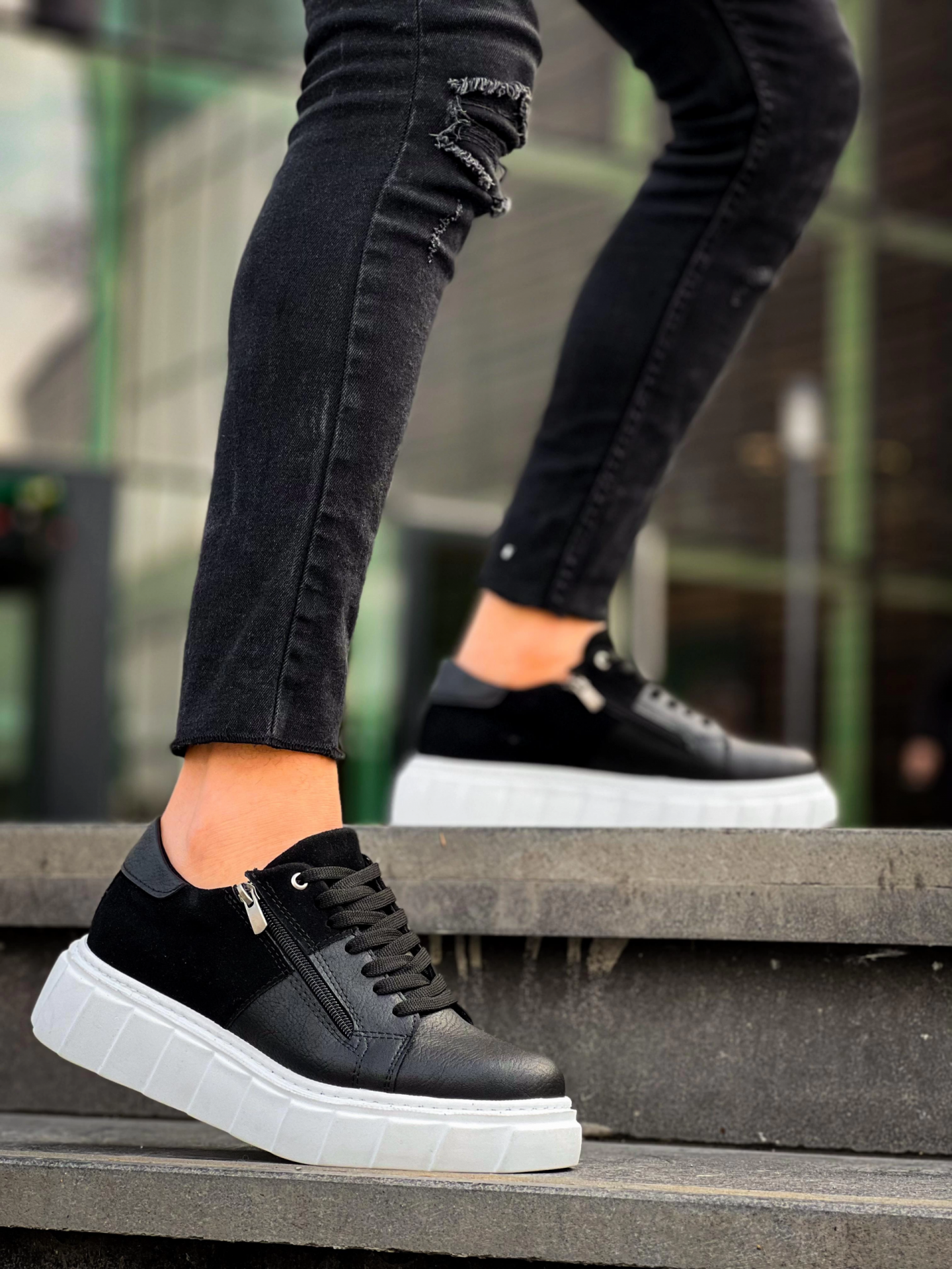 KB-X155 Kuback Siyah Cilt Siyah Süet Detaylı Beyaz Yüksek Taban Günlük Spor Ayakkabı