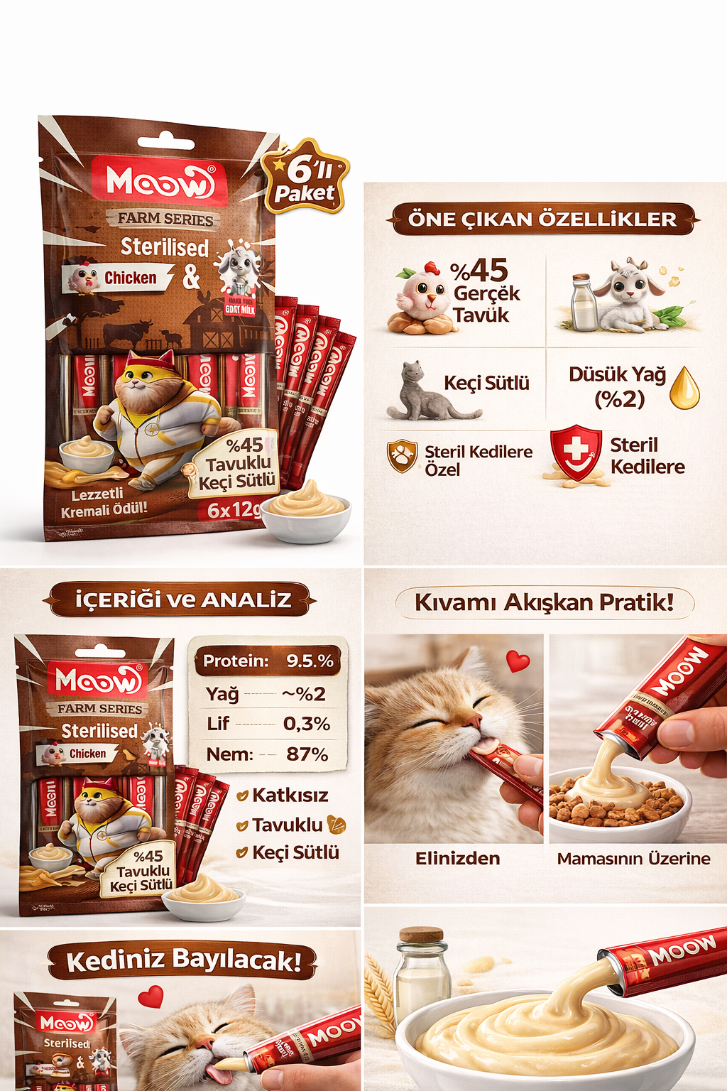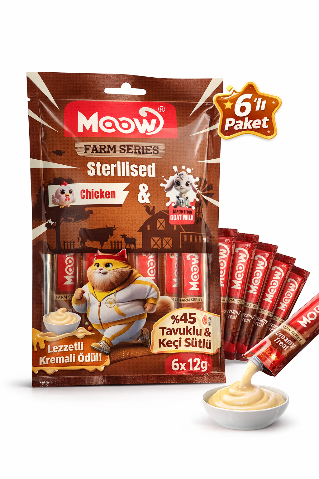 Tavuklu Keçi Sütlü 12gr x 6 Adet Sterilised Kedi Krema Ödülü - 13441 - - MOOW, kısırlaştırılmış kediler için sağlıklı ve doğal içeriklerle formüle edilmiş ödül mamaları sunar. Bu özel ödül, %45 tavuk göğsü ve %5 keçi sütü içeriği ile kedinizin hem damak