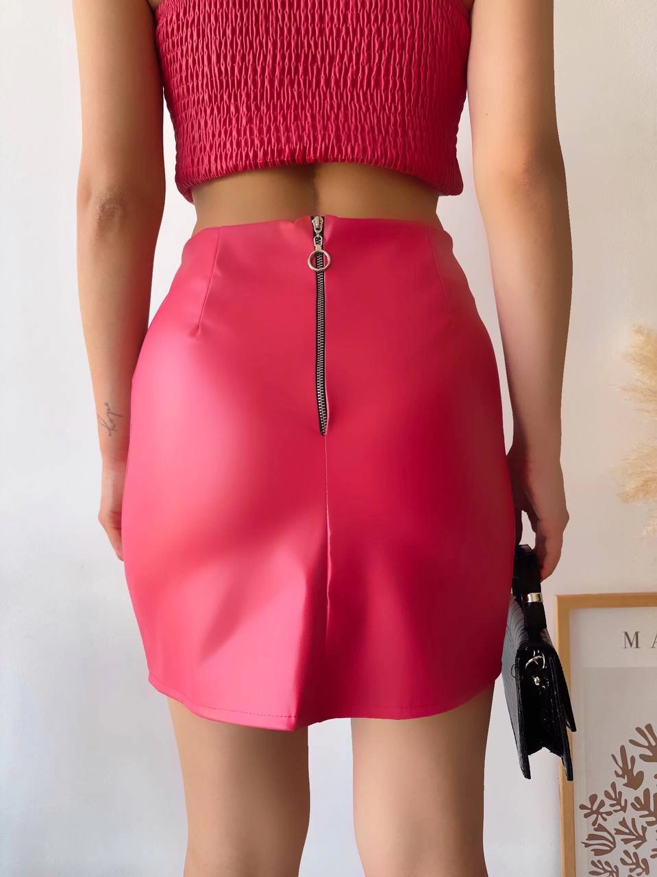 Tek yırtmaçlı arkadan fermuarlı deri etek fuşya s24475