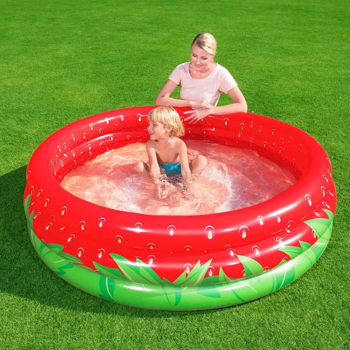 Sıcak yaz aylarında çocuklar için serin bir eğlence fırsatı olan Bestway 3 Halka Çilekli Şişme Havuz sizlerle!